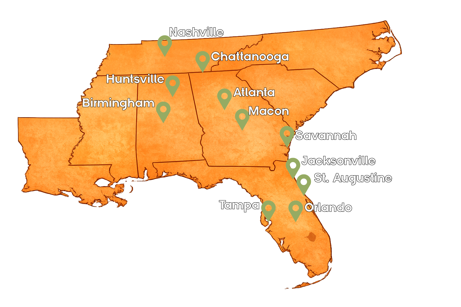 We proudly serve clients throughout Georgia, Florida, and the Southeast, including Atlanta, Macon, Savannah, Jacksonville, St. Augustine, Orlando, Tampa. Nashville, Chattanooga, Huntsville, Birmingham and destination locations beyond.
